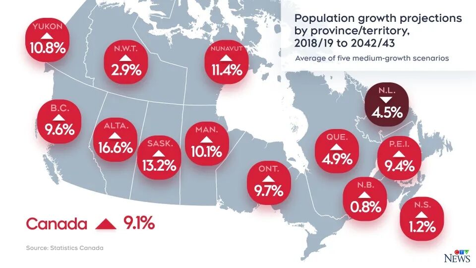 加拿大统计局估计,在2021年初,加拿大人口刚刚超过3800万。在2018年的一次展望中,该机构估计在中等增长的速度下,到2043年,人口将达到4650万。也就是说,预计在接下来的22年里,人口将增加850万。