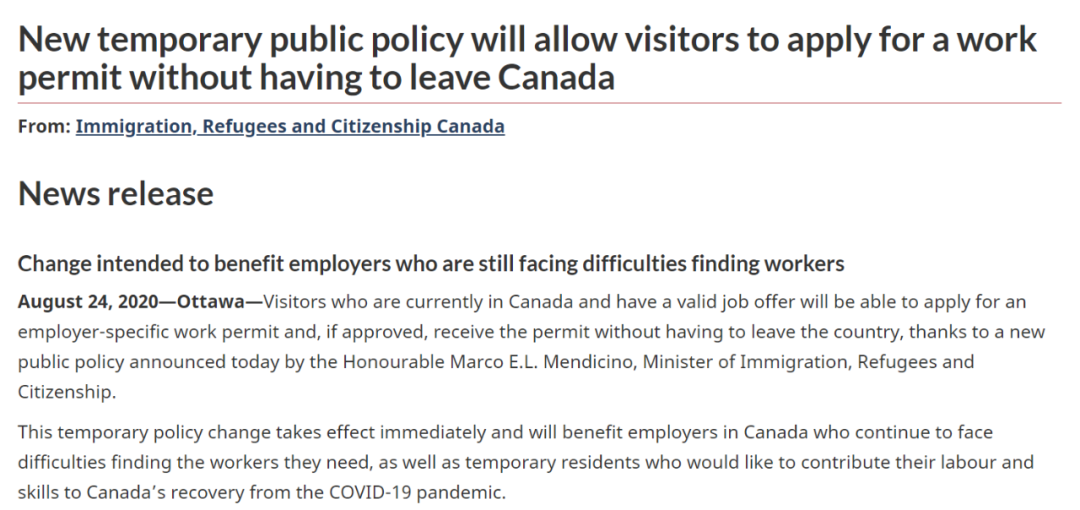 由于疫情影响,加拿大缺乏劳动力,同时很多游客滞留加拿大无法回国。所以,在加拿大当地时间2020年8月24日,加拿大移民局同时在官网、FB和推特上宣布,在特殊时期实行临时的工签处理办法。